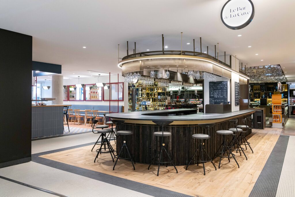 - Mercado gourmet y bodega: El sótano alberga un supermercado premium con carnes frescas, mariscos, quesos artesanales de todas las regiones de Francia y patés de la más alta calidad. En el segundo piso se encuentra una impresionante bodega de vinos con más de 100 etiquetas de vinos tintos, champagnes y licores, además de un bar donde puedes degustar vinos por copa mientras decides cuáles llevar a casa.